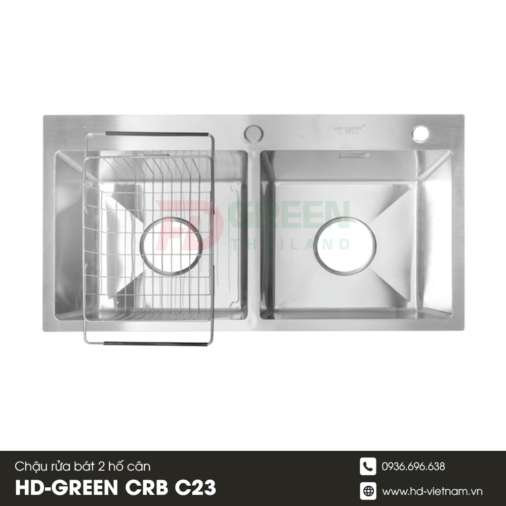 Chậu rửa bát HD-GREEN CRB C23 mang lại sự tiện ích với thiết kế 2 hố cân tiện dụng, có tích hợp lỗ gắn vòi bếp nóng lạnh và lỗ phụ cho vòi đa năng. Sản phẩm sử dụng chất liệu Inox 304 cao cấp, được dập nguyên khối và phủ nano kháng khuẩn, tạo nên độ bền cao, chống trầy xước, dễ dàng vệ sinh. Kích thước D.800 x R.500mm giúp chậu phù hợp với nhiều không gian bếp hiện đại, đảm bảo hiệu suất sử dụng và vẻ ngoài sang trọng.