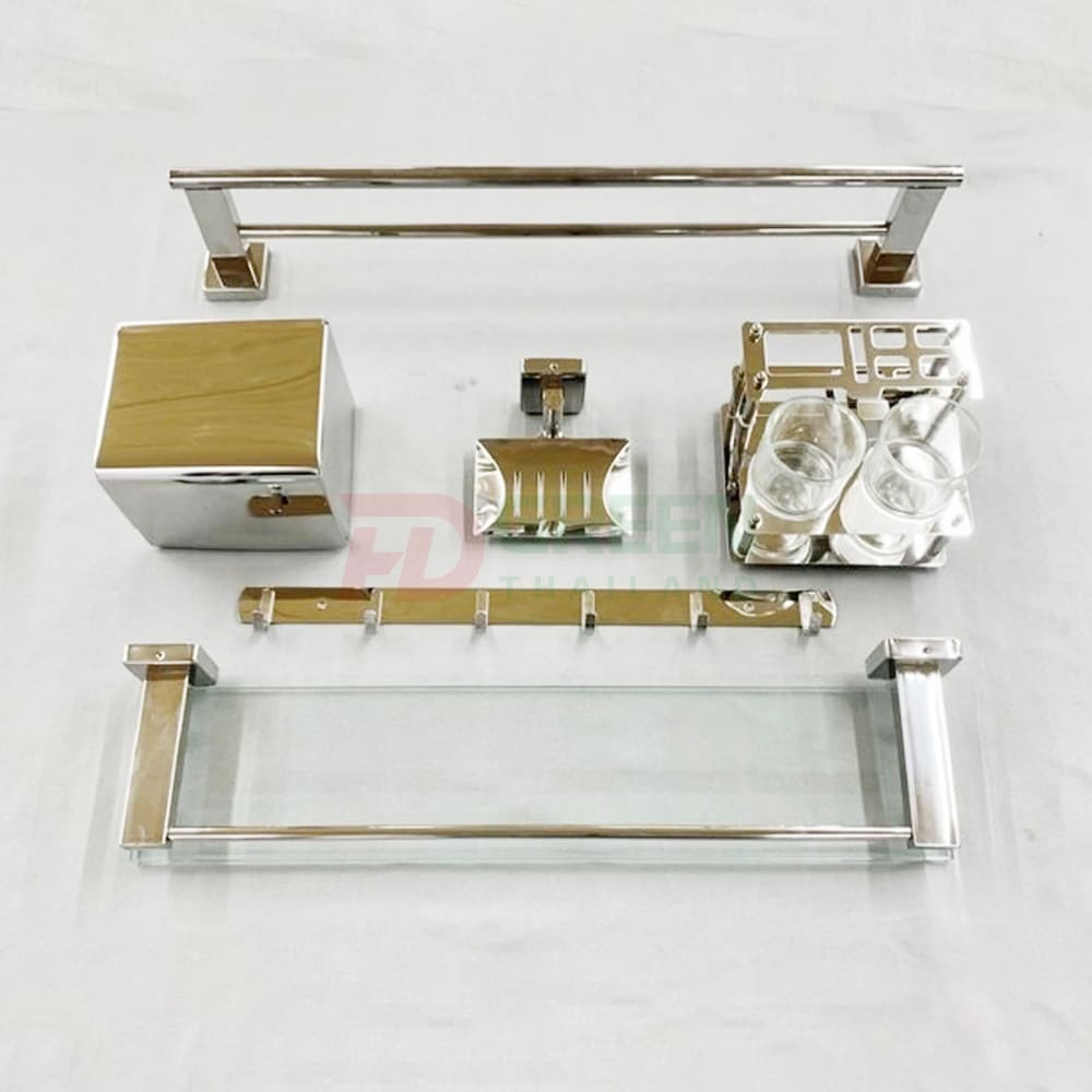 Bộ sản phẩm gồm: Kệ gương, thanh vắt khăn, kệ xà phòng, móc áo, kệ đựng ly, lô giấy