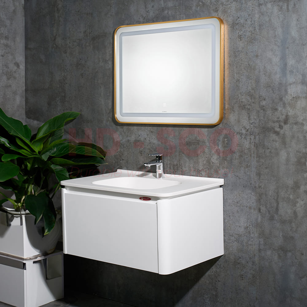 - Gương trang trí LED với chức năng ON/OFF cảm ứng và ánh sáng hắt viền, bo viền nhôm vàng mang đến vẻ đẹp hiện đại và tiện nghi.