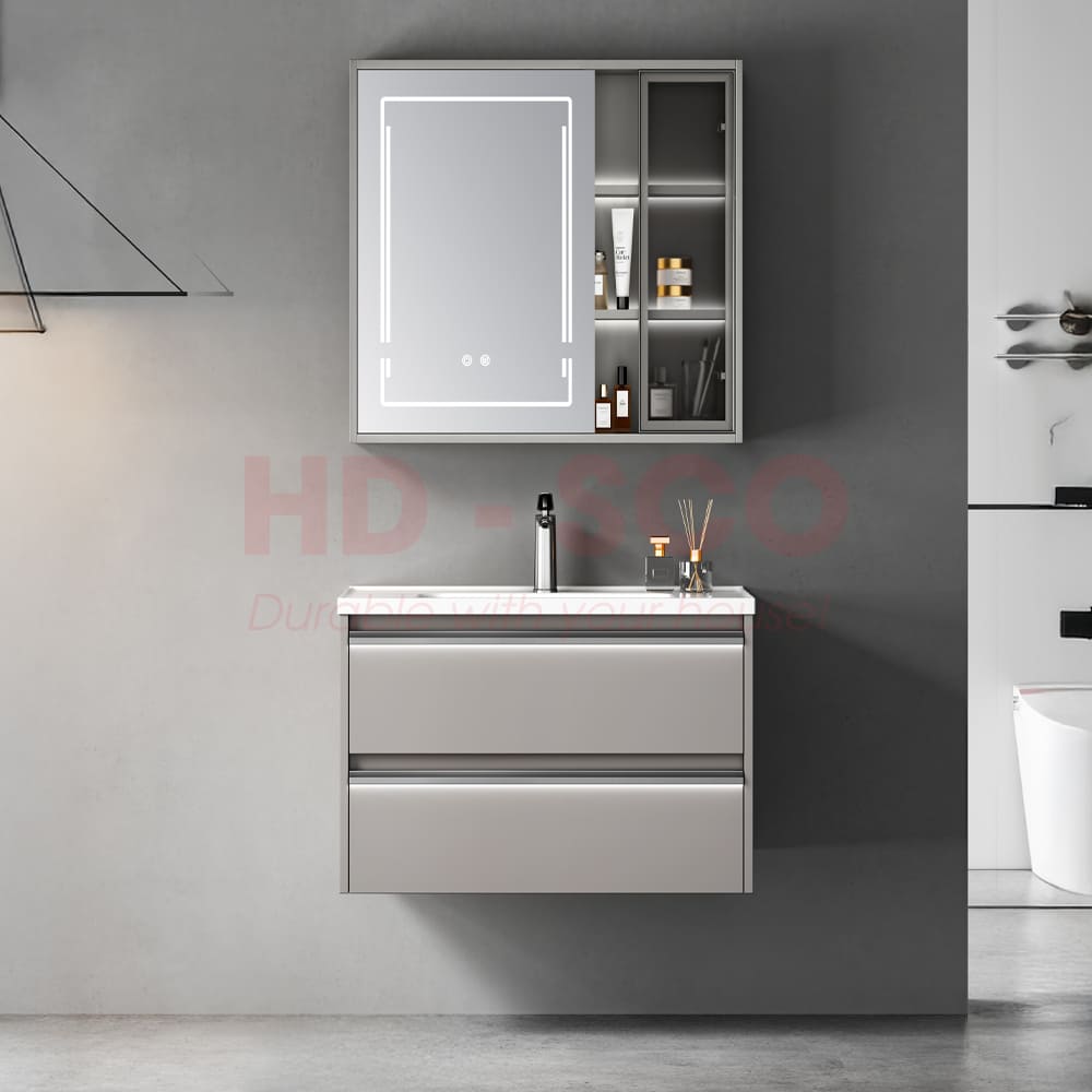 - Chất liệu: Tủ chậu SPC kết hợp nhôm tổ ong, chậu sứ men phủ nano.