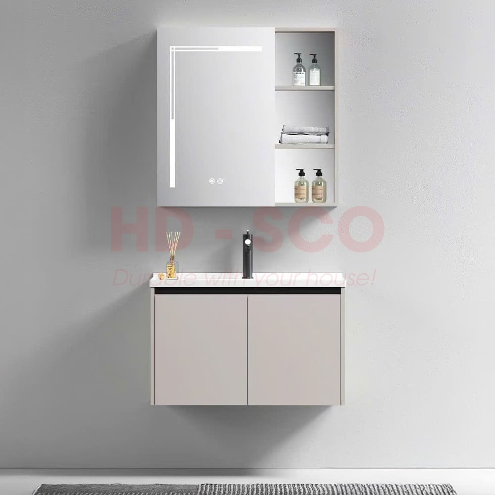 - Chất liệu: Thân tủ SPC kết hợp nhôm tổ ong, chậu sứ men phủ nano trắng, gương LED có sấy gương, bật/tắt ON/OFF.