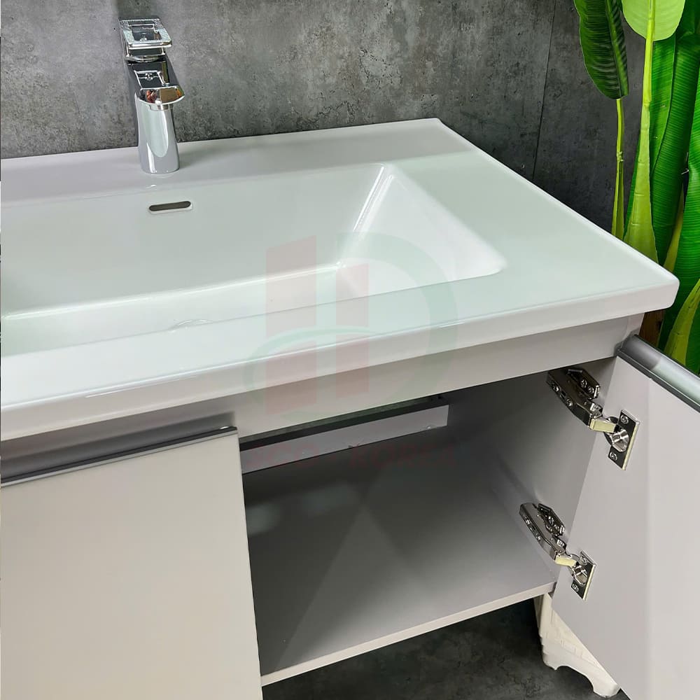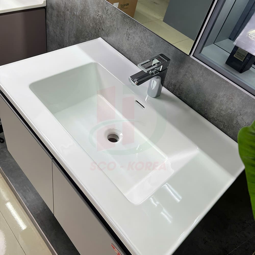 - Chất liệu: Thân tủ SPC kết hợp nhôm tổ ong, chậu sứ men phủ nano.