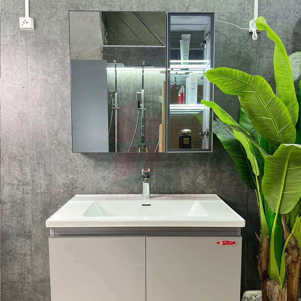 - Kích thước: Tủ chậu 800x500x465mm, tủ gương 750x134x700mm.