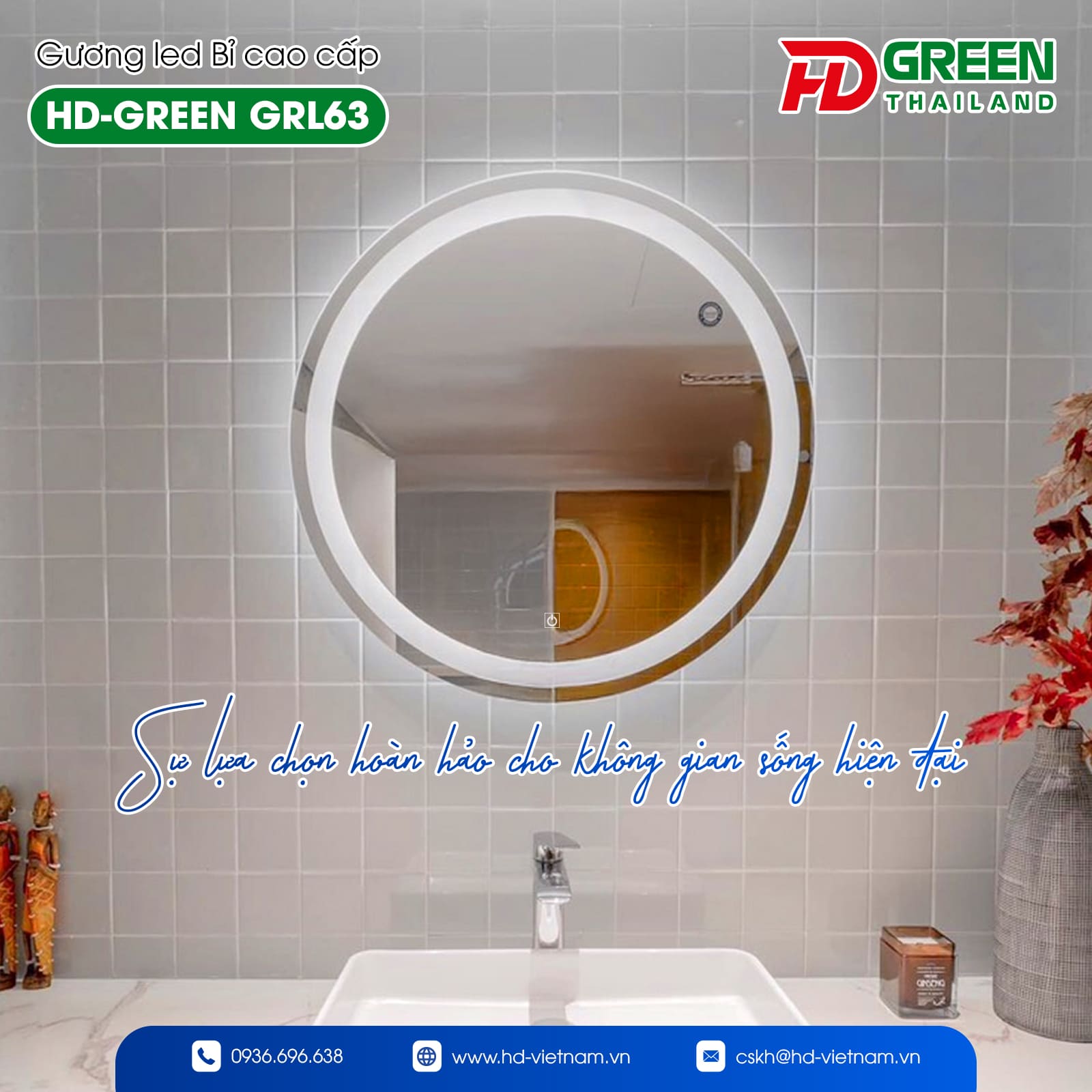 Gương LED HD-GREEN GRL63 hắt sáng dịu nhẹ tạo chiều sâu cho phòng tắm.