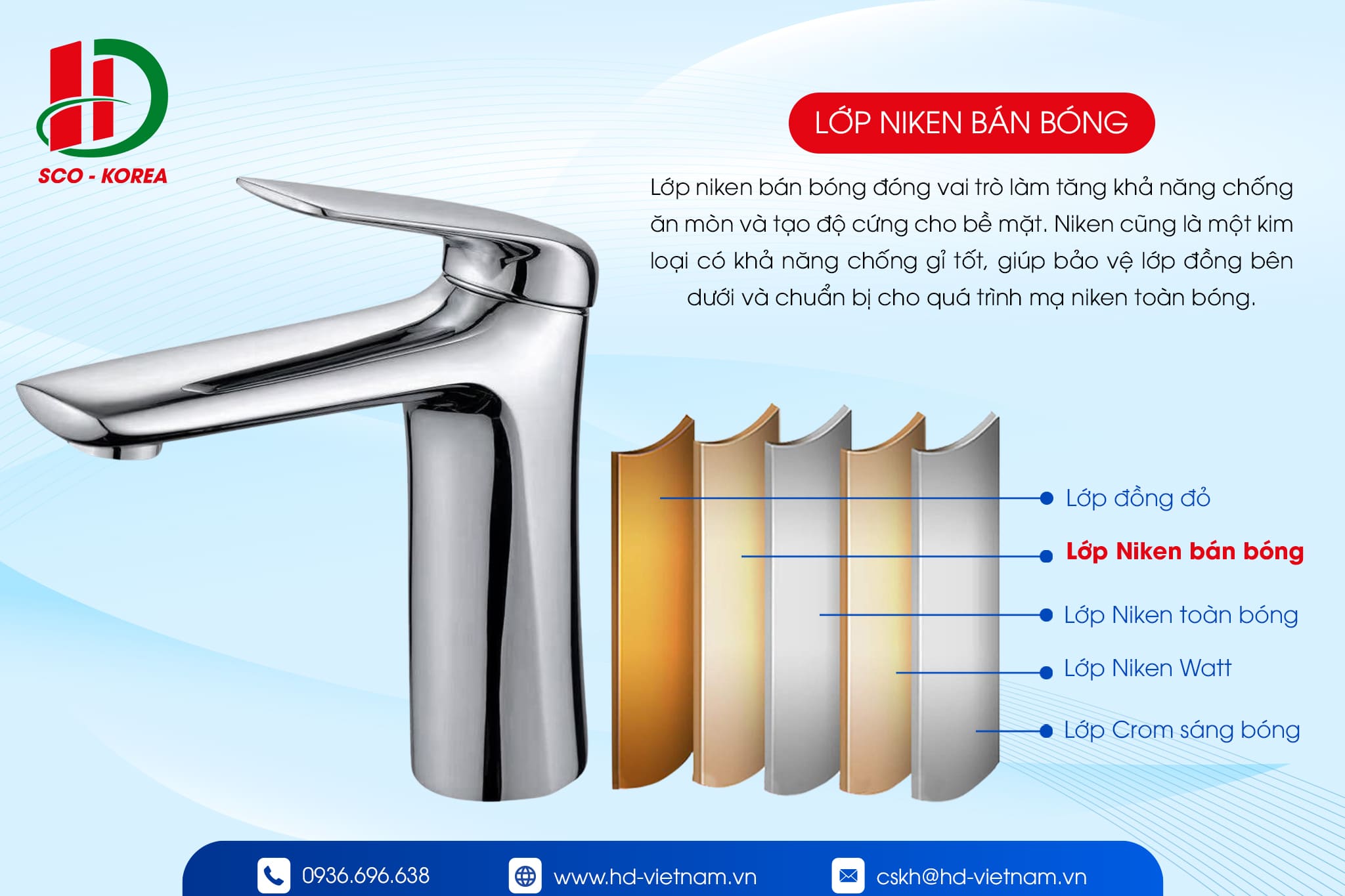 Khi nói đến các sản phẩm của HD-SCO, một trong những yếu tố nổi bật chính là lớp mạ 5 lớp bao gồm: lớp đồng đỏ, lớp niken bán bóng, lớp niken toàn bóng, lớp niken watt và lớp mạ crom sáng bóng. Quy trình mạ này không chỉ tạo nên vẻ ngoài sáng bóng, đẹp mắt mà còn mang lại độ bền vượt trội và khả năng chống ăn mòn cao. Dưới đây là phân tích chi tiết về từng lớp mạ: