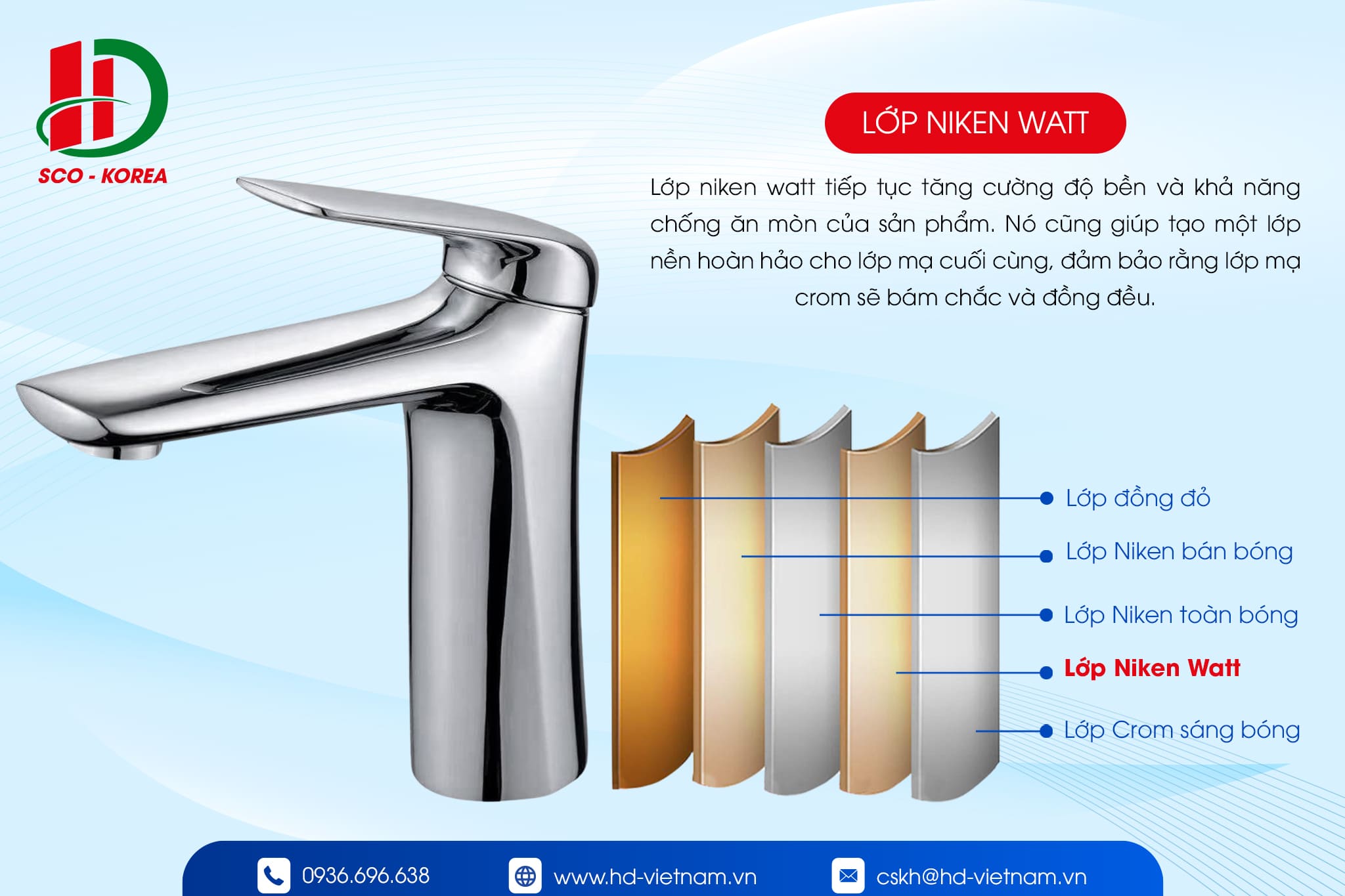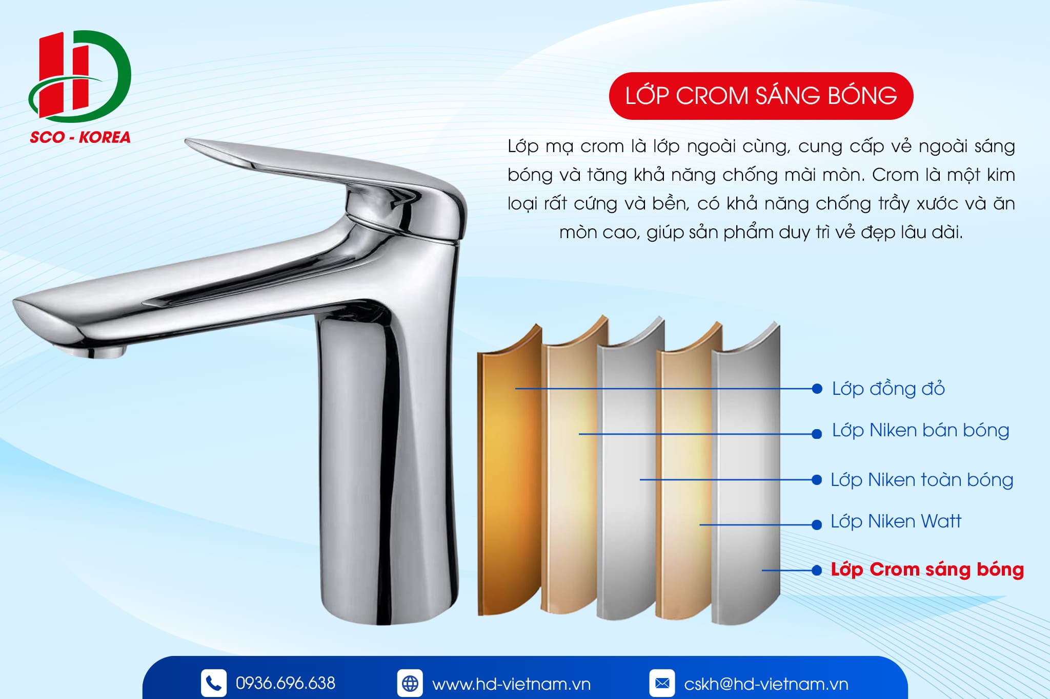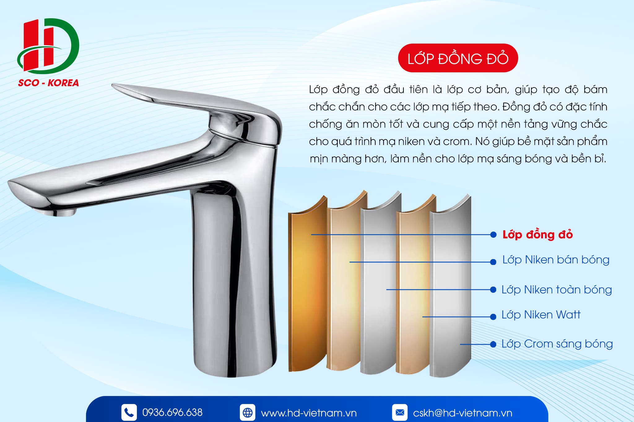 Khi nói đến các sản phẩm của HD-SCO, một trong những yếu tố nổi bật chính là lớp mạ 5 lớp bao gồm: lớp đồng đỏ, lớp niken bán bóng, lớp niken toàn bóng, lớp niken watt và lớp mạ crom sáng bóng. Quy trình mạ này không chỉ tạo nên vẻ ngoài sáng bóng, đẹp mắt mà còn mang lại độ bền vượt trội và khả năng chống ăn mòn cao. Dưới đây là phân tích chi tiết về từng lớp mạ: