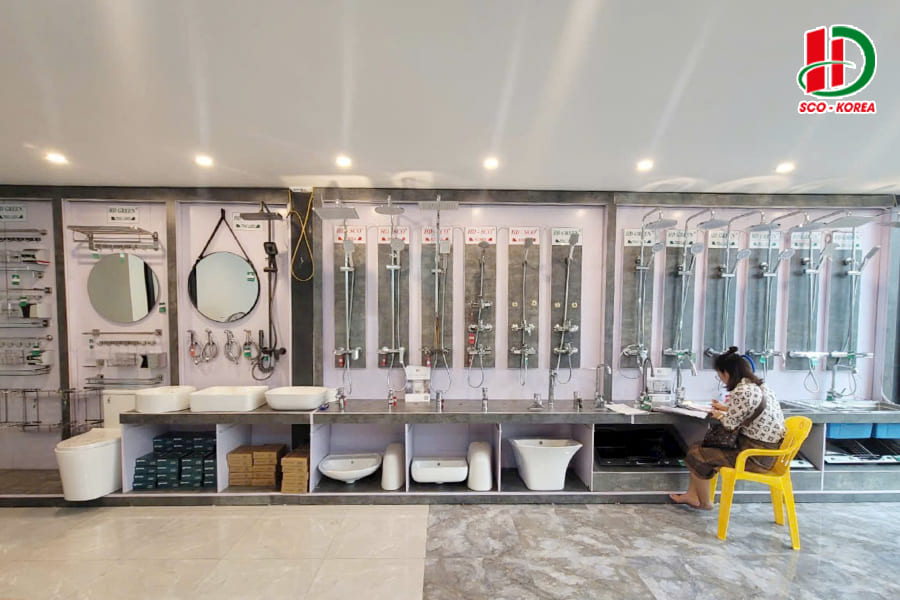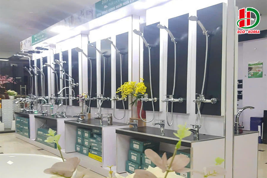 Hình ảnh tổng quan các sản phẩm thiết bị vệ sinh HD-SCO được trưng bày trong showroom.