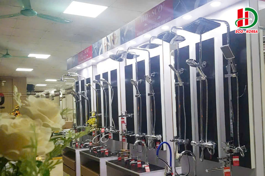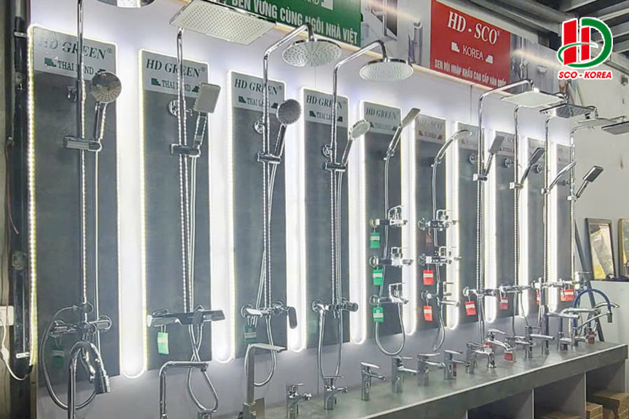 Hình ảnh tổng quan các sản phẩm thiết bị vệ sinh HD-SCO được trưng bày trong showroom.